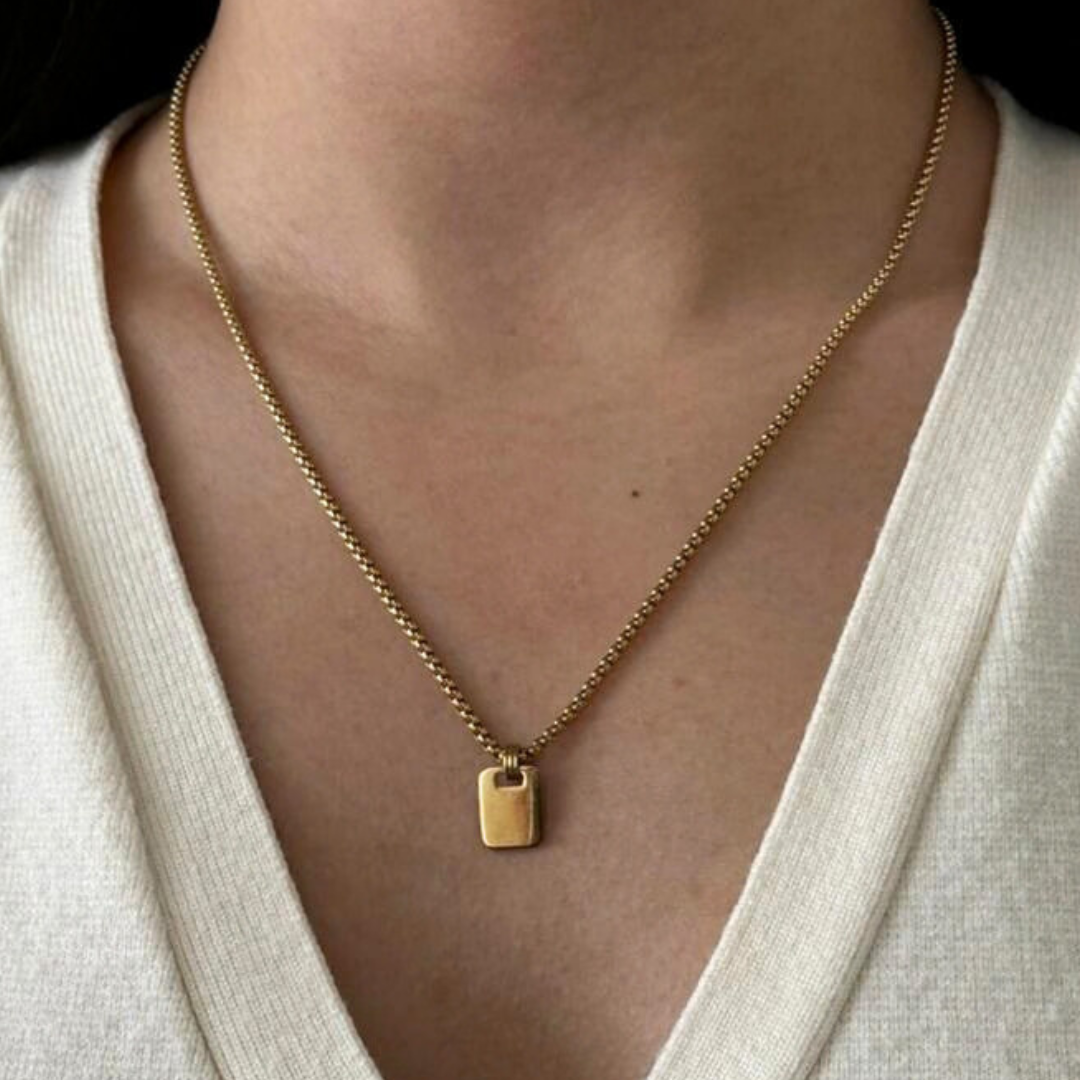 El CUSTOM TAG ICON NECKLACE pertenece a THE ICON COLLECTION y combina diseño minimalista con un toque personalizado. Su cadena en color dorado sostiene una plaquita que puedes grabar con tus inicial, creando una pieza única y significativa. Perfecto para usar todos los días o para regalar.