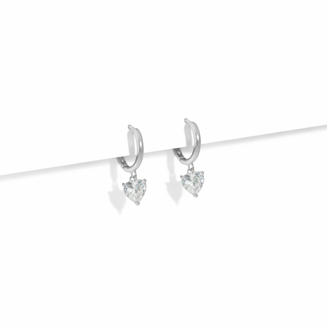 Medida: 1.9cm de largo total, huggie 1.1cm de diámetro, zirconia corazón 8mm de largo y 7mm de ancho.