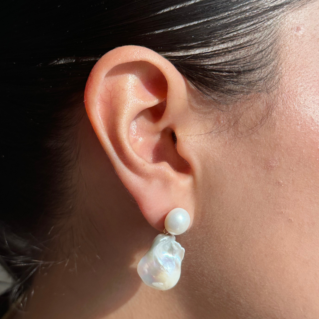 Los Baroque Pearl Glow Earrings combinan lo clásico con un toque moderno. Su perla barroca colgante aporta movimiento y un brillo natural que resalta con elegancia. Son ideales para elevar cualquier look con un estilo sutil, femenino y lleno de luz.