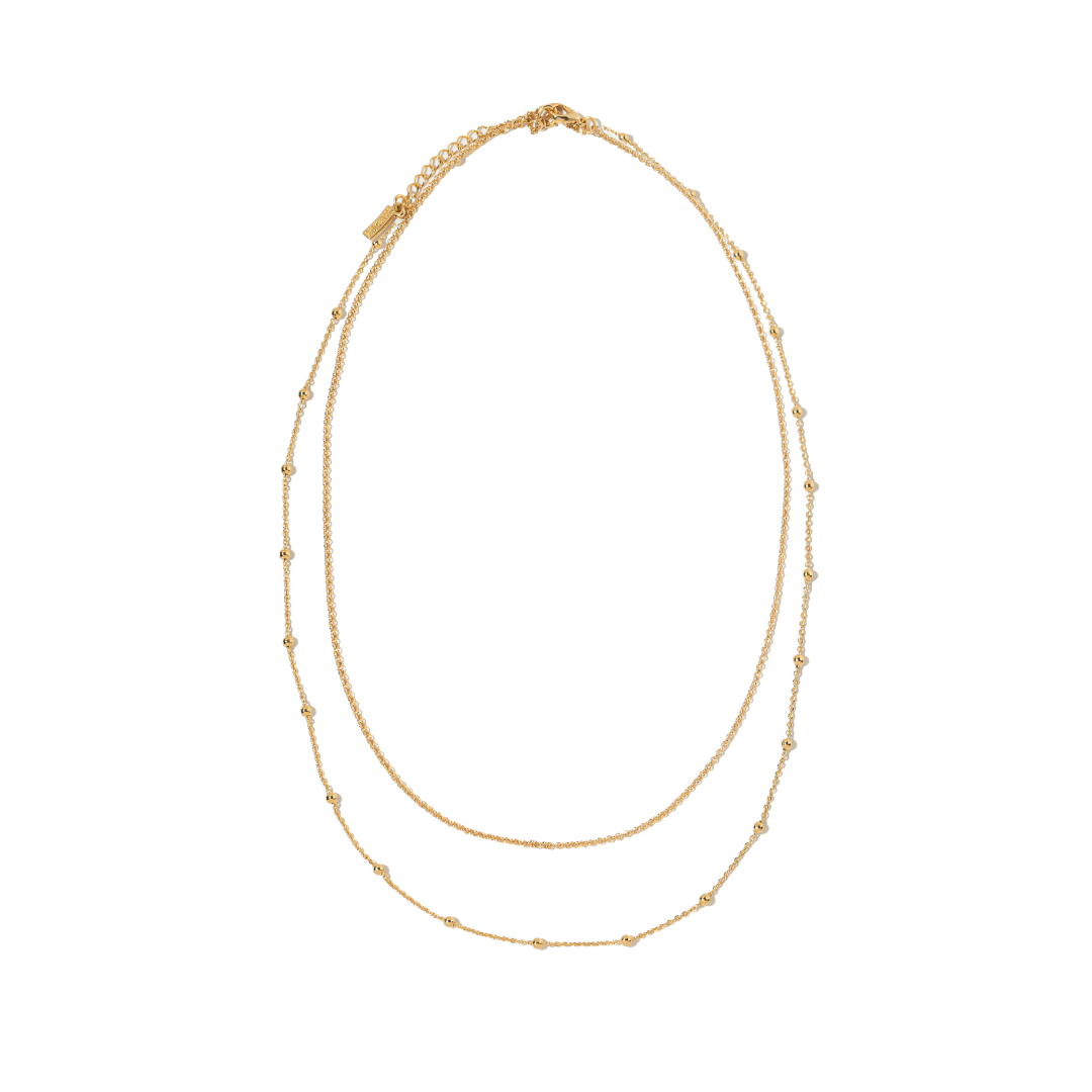 El Layered Gold Dots Necklace es un layering delicado y lleno de brillo sutil. Con dos cadenas doradas decoradas con pequeños puntos metálicos, es una pieza versátil que añade textura y luz a cualquier look. Perfecto para usar solo o combinar con tus collares favoritos.