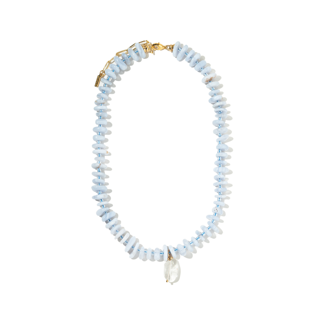 El BLUE CHALCEDONY TERRA NECKLACE está diseñado con cuentas de calcedonia en un tono azul suave que le dan un acabado fresco y elegante. Al centro, un dije de cuarzo aporta un contraste sutil y sofisticado, creando una pieza versátil que complementa cualquier estilo.