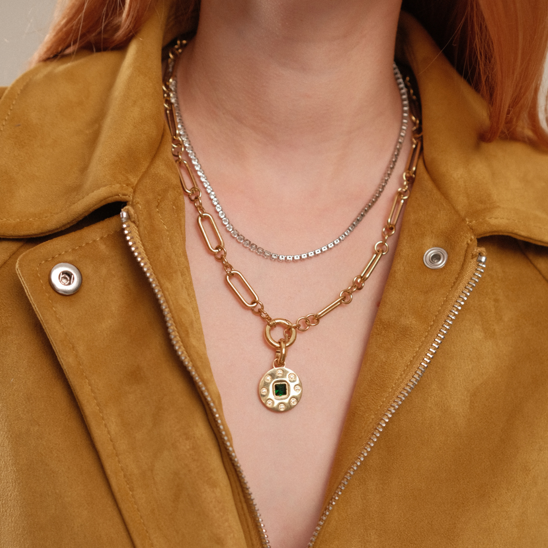 El Emerald Portal Charm destaca por su diseño circular en acabado dorado pulido, decorado con pequeñas zirconias que rodean un centro protagonista: una piedra verde corte cuadrado que aporta un contraste vibrante y elegante. Una pieza llamativa y sofisticada, perfecta para agregar un toque de color a tus cadenas favoritas.