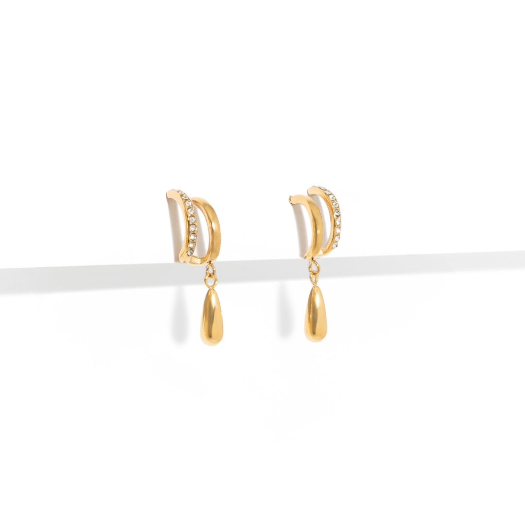 Los GOLD LUMEN DROP HUGGIES son aretes dorados con arracada pulida y caída en forma de gota que aporta movimiento y brillo sutil. Su diseño combina líneas suaves con un acabado luminoso, logrando una pieza versátil que eleva cualquier look, de día o de noche.