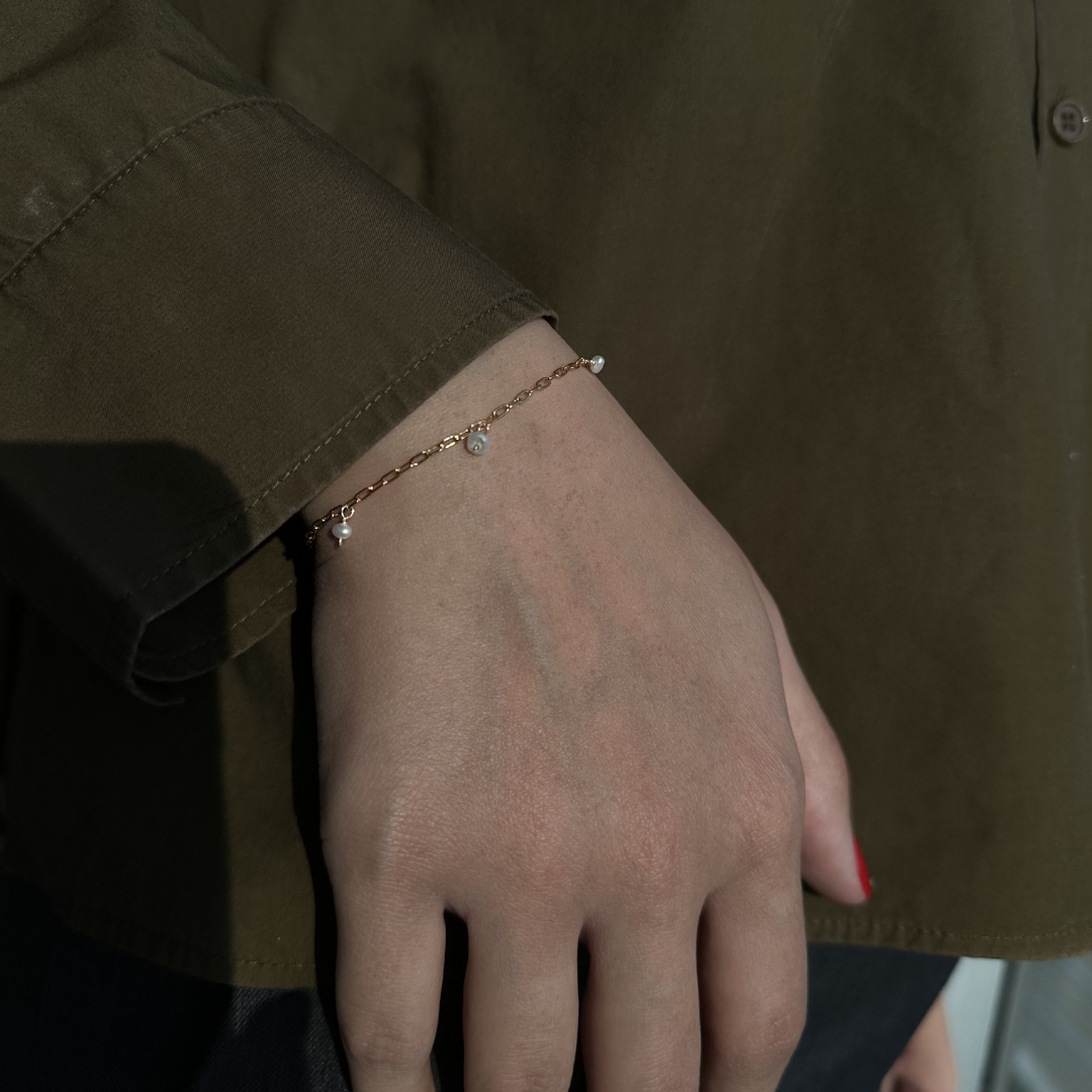 El PEARL BEAD BRACELET es una pulsera de cuentas con perla natural que aporta elegancia clásica y un brillo delicado.