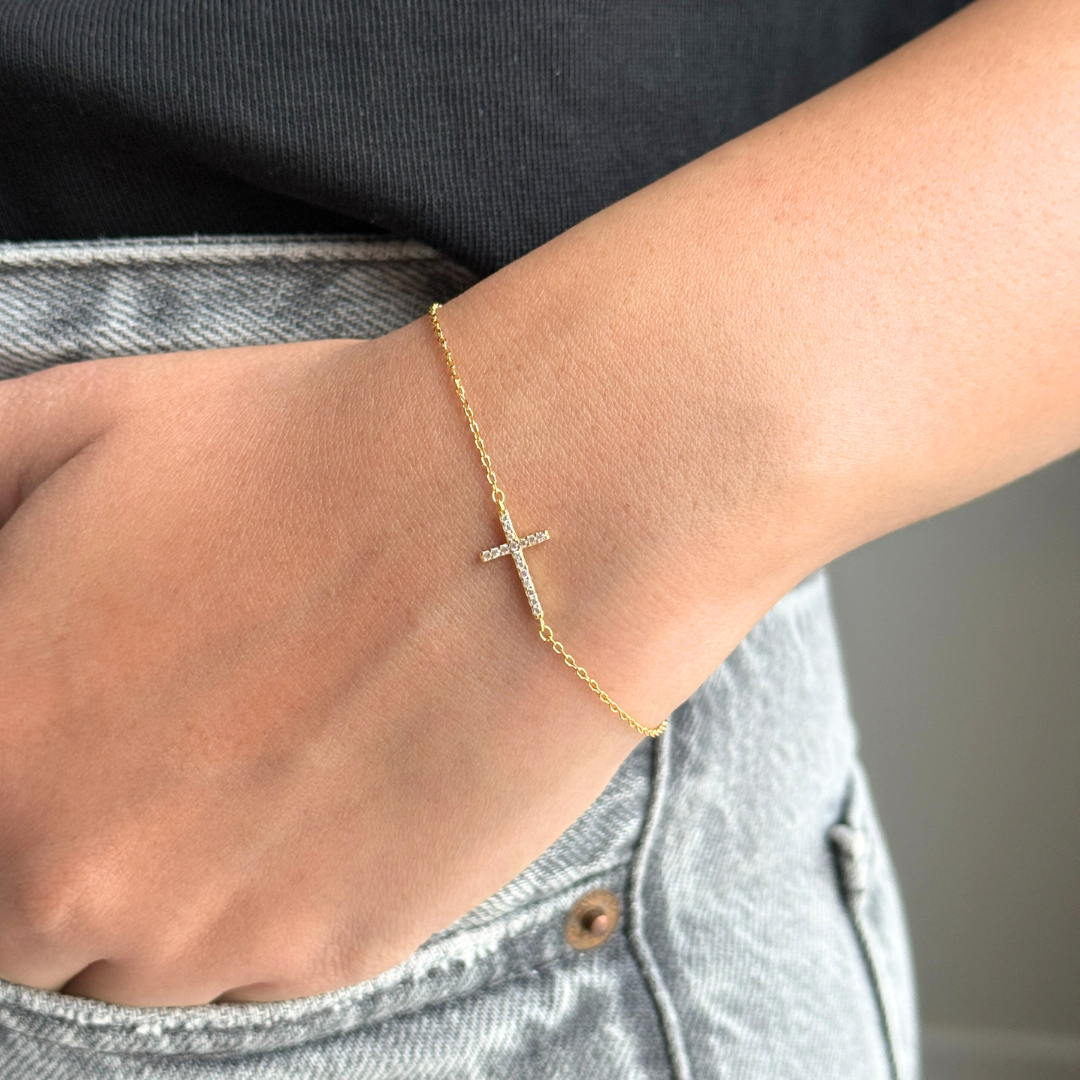 La Golden Blessed Spark Bracelet es una pulsera dorada con un dije de cruz lleno de zirconias que brillan con cada movimiento. Es el equilibrio perfecto entre delicadeza y significado: una joya para llevar tu luz y tu fe contigo todos los días. Sutil, especial y con ese spark que te representa.