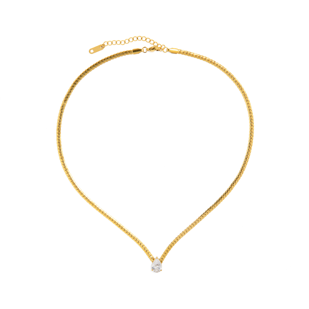 El Golden Gleam Drop Necklace combina una cadena dorada plana con un delicado dije en forma de gota que capta la luz con cada movimiento. Un diseño elegante y luminoso que resalta por su sencillez, ideal para llevar en cualquier ocasión.