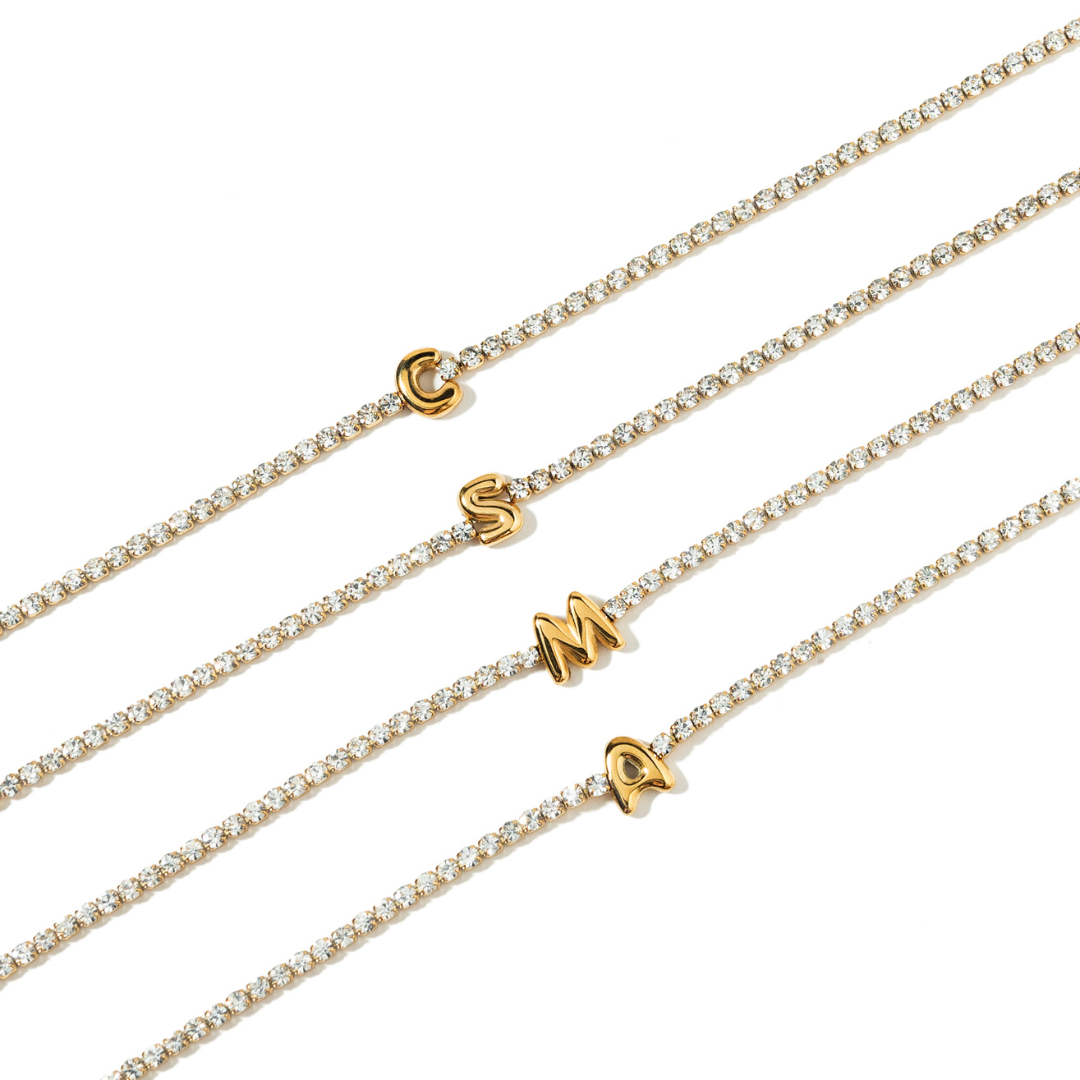 La TENNIS INITIAL LUXE BRACELET es un accesorio que fusiona elegancia y estilo juvenil. Con su diseño tipo tennis y la inicial en color dorado, aporta un toque sofisticado y personalizado.