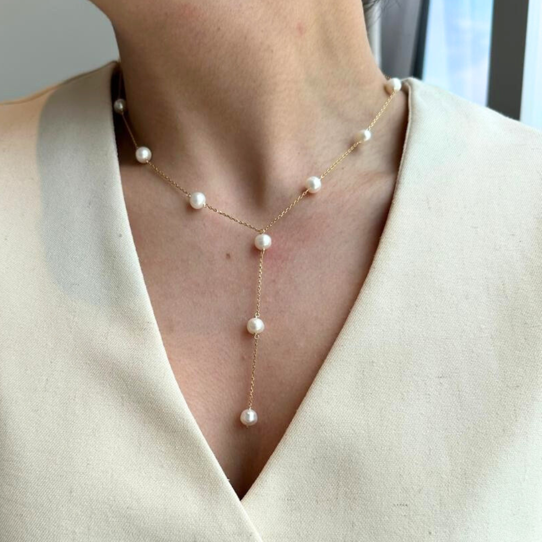 El Pearl Lariat Luxe Necklace es una pieza que destaca por su elegancia y originalidad. Su diseño tipo lariat con perlas y detalles dorados crea una caída delicada y favorecedora. Ideal para looks que buscan un toque femenino, moderno y sofisticado.