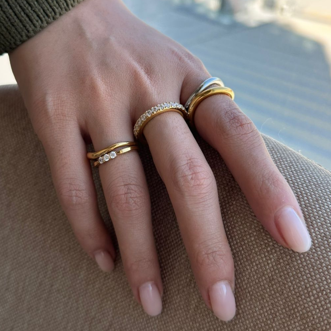 Clásico, radiante y atemporal. El Eternal Shine Ring destaca por su delicado diseño de zirconias engastadas que envuelven el aro con un brillo continuo. Su acabado dorado refleja elegancia y sofisticación, convirtiéndolo en la pieza ideal para llevar sola o combinar en stack.