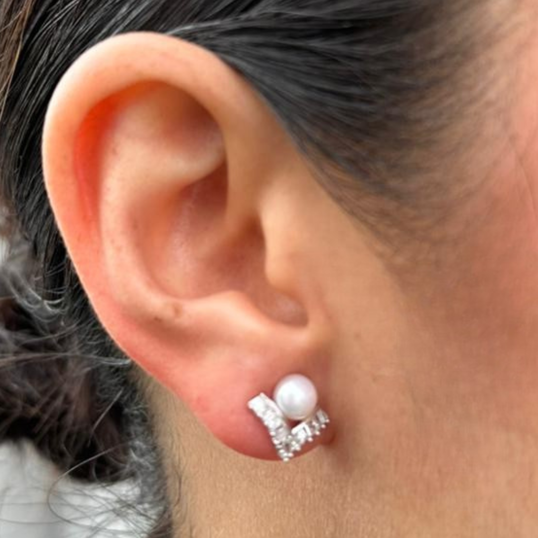 Los Pearl Luxe Silver Studs combinan la delicadeza de una perla brillante con un detalle de zirconias plateadas que aporta luz y sofisticación. Un diseño moderno y atemporal que realza cualquier look, perfecto para usar solo o complementar con tus piezas favoritas.