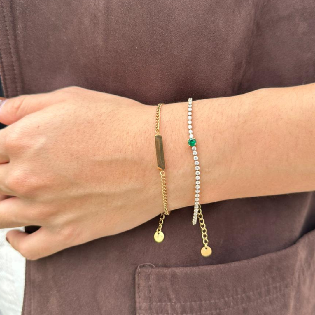 Incluye: 1 pulsera dorada y 1 pulsera tennis con zirconia verde