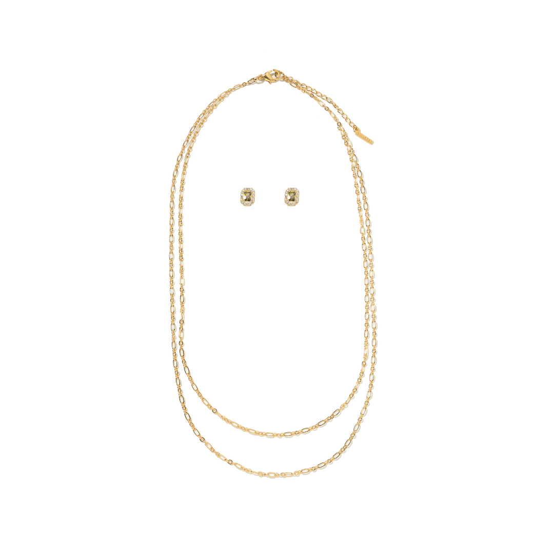 El Gold & Emerald Layered Gift Set combina el brillo cálido del oro con el encanto profundo de la zirconia verde en un dúo que enamora. Incluye una cadena doble dorada, ideal para crear un layering elegante sin esfuerzo, y unos aretes con zirconia verde que añaden un toque sofisticado y vibrante.