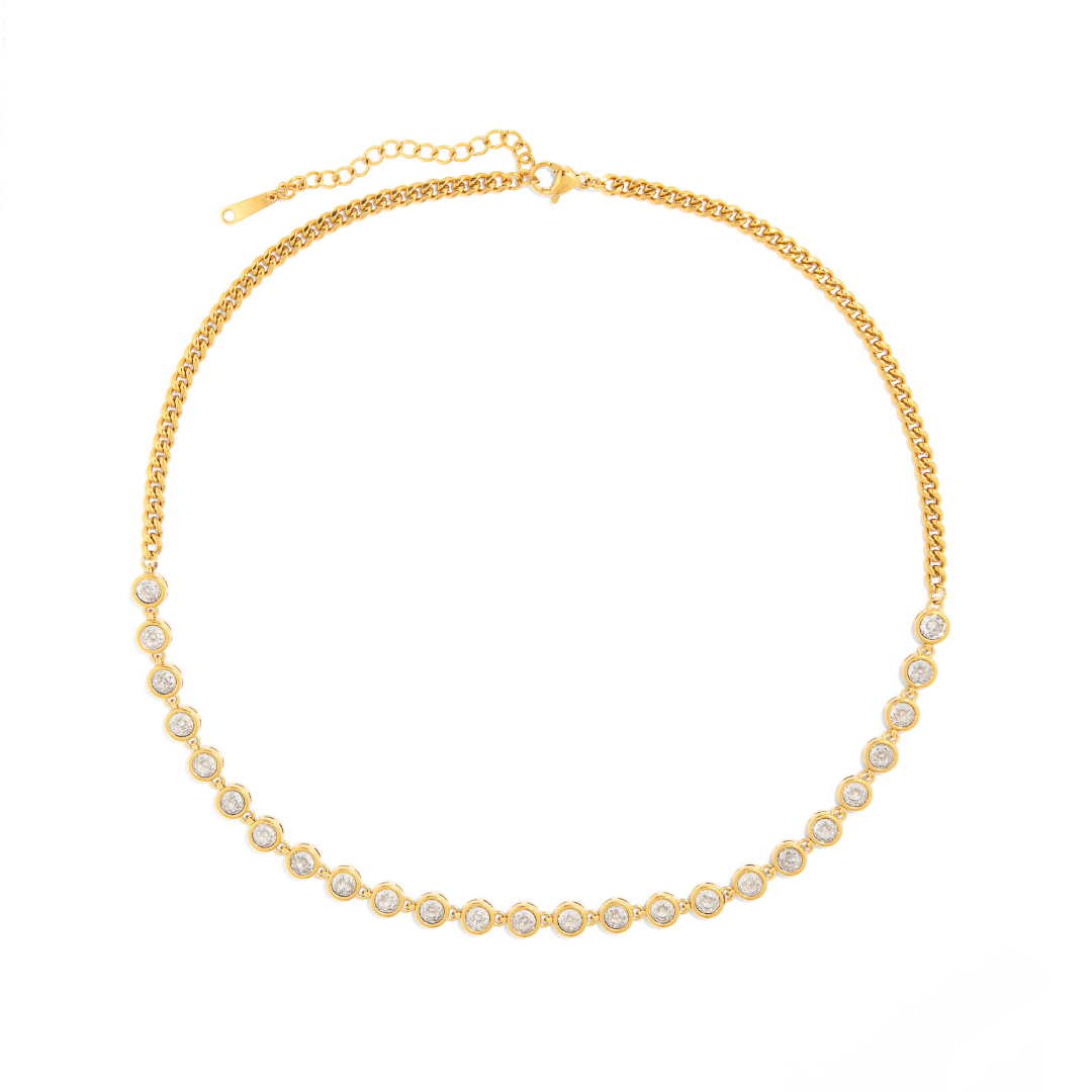 Un glow que no pasa desapercibido. El Golden Luxe Orbit Necklace mezcla el dorado con brillos en forma circular que giran contigo. Perfecto para elevar tu look de día o de noche, con ese toque classy pero cool.