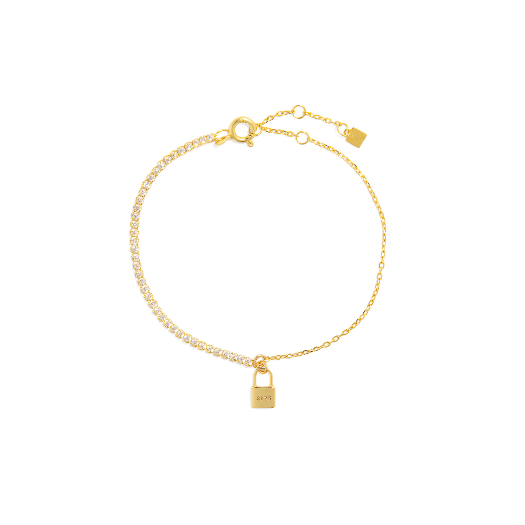 The GOLDEN SERENA LOCK BRACELET is a piece full of charm and sophistication. With one half of sparkling zirconias that add a touch of glamour and a golden chain that perfectly complements the design, this bracelet is everything you need to stand out. The padlock-shaped charm adds a unique and mysterious detail, making it the perfect accessory for any occasion.