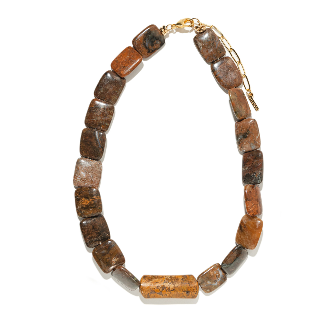 Este collar JASPER QUARTZ TERRA NECKLACE combinación única de cuarzo y jaspe con matices de madera que crea una armonía de tonos tierra y texturas naturales. Su diseño robusto y elegante lo convierte en una pieza distintiva, ideal para elevar cualquier look con un toque cálido y sofisticado.