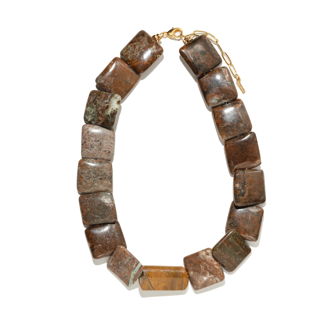 Inspirado en los matices cálidos de la tierra, el Terracotta Jasper Terra Necklace combina piedras naturales de jaspe brechado y jaspe con matices de madera, creando un equilibrio entre textura y color. Sus tonos terracota y marrón hacen de este collar una pieza versátil y sofisticada, ideal para resaltar cualquier look con un toque orgánico y elegante.