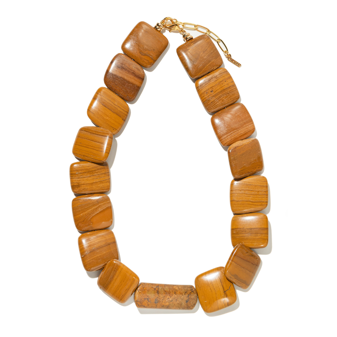 El Wood Jasper Terra Necklace destaca por sus tonos cálidos y vetas naturales que evocan la textura de la madera. Cada cuenta de jaspe ha sido cuidadosamente seleccionada para resaltar su belleza orgánica, creando una pieza con carácter y elegancia terrosa.