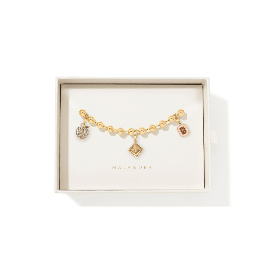 BLUSH GLOW CHARMS GIFT SET combina una pulsera dorada con tres charms que aportan un brillo femenino y sofisticado. Un durazno rosa con destellos suma un toque glam, un ravioli dorado que añade elegancia y la gema rosa aporta un acento delicado y luminoso.